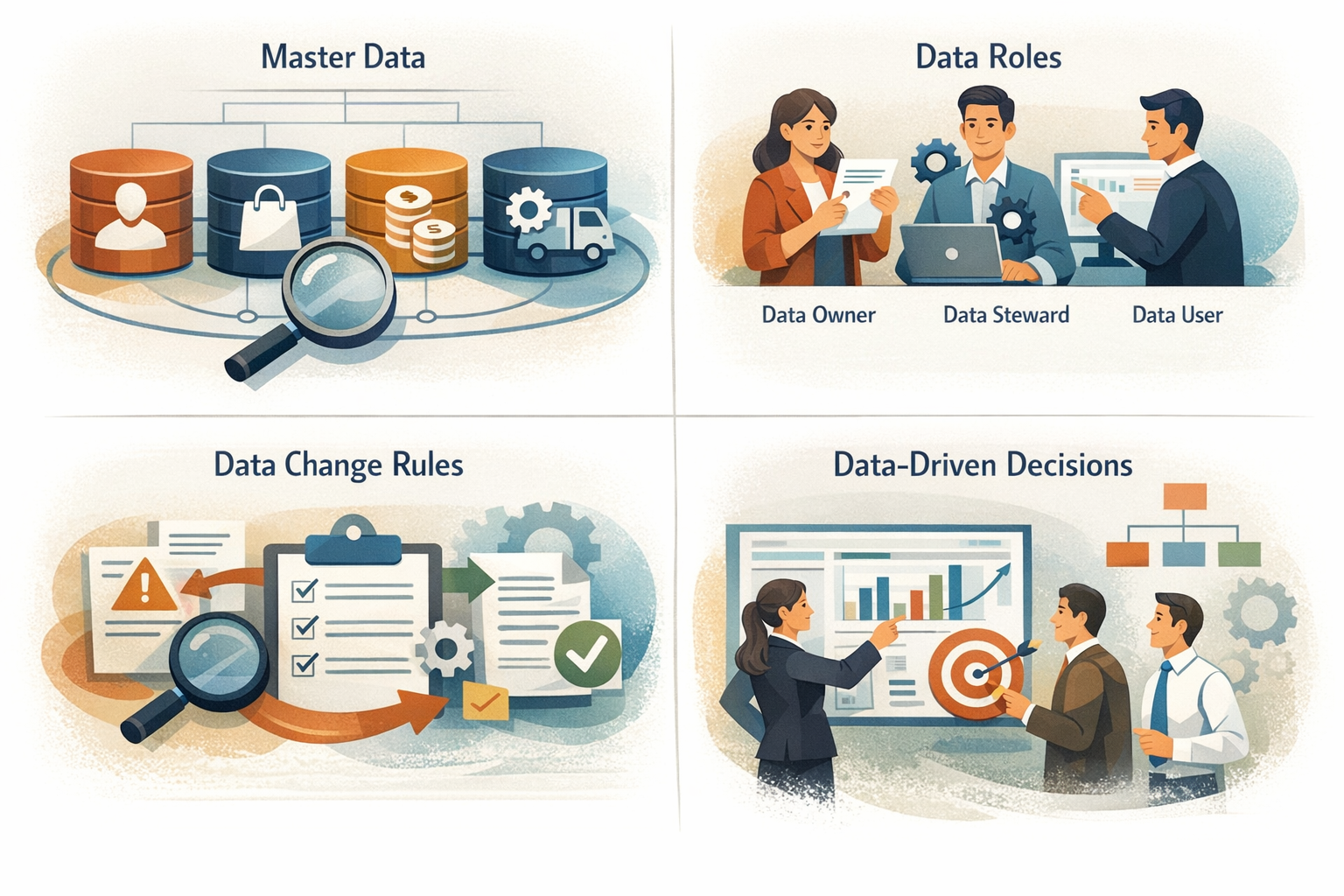 Trong các doanh nghiệp lớn và các khung quản trị MBA, Data Governance không được hiểu là một dự án IT. Nó là một hệ thống chính sách, vai trò và cơ chế ra quyết định xoay quanh dữ liệu. Nói cách khác, Data Governance trả lời ba câu hỏi nền tảng: dữ liệu này dùng để làm gì, ai chịu trách nhiệm về nó, và nó được sử dụng trong những quyết định nào.