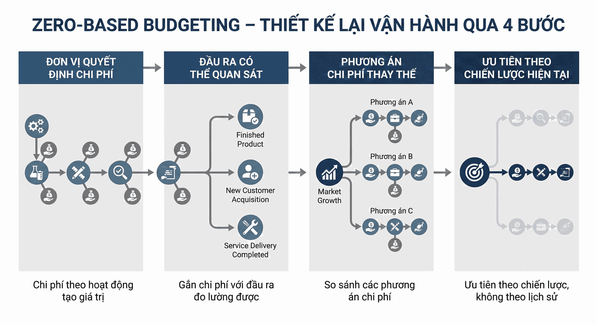 Lúc này, áp lực chi phí không đến từ khủng hoảng, mà đến từ sự tích tụ âm thầm. Doanh nghiệp vẫn hoạt động, vẫn có lợi nhuận, nhưng cảm giác “nặng dần” trong vận hành ngày càng rõ. Zero-based Budgeting xuất hiện như một lời nhắc tỉnh táo: thay vì hỏi “điều gì cần điều chỉnh”, hãy hỏi lại từ đầu “điều gì thật sự cần tồn tại”.