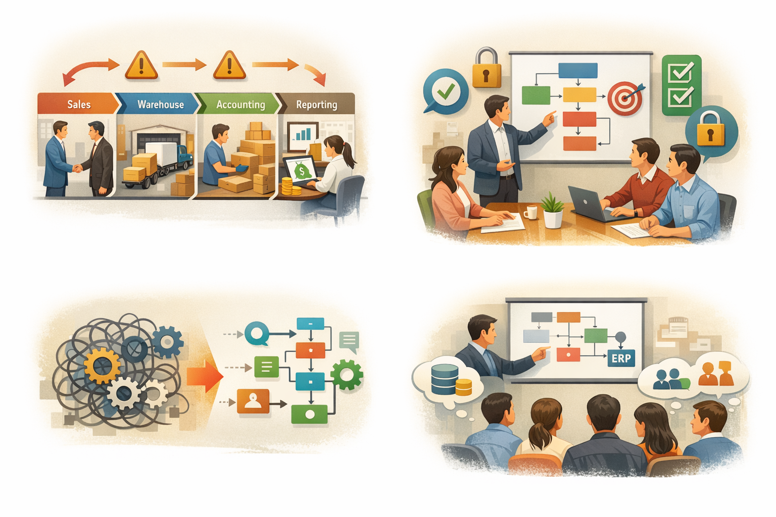 Giải pháp không phải chỉnh thêm tính năng, mà là quay lại thiết kế lại cách các bộ phận phối hợp, xác định rõ điểm chốt dữ liệu và trách nhiệm. Khi cấu trúc vận hành được làm rõ, ERP bắt đầu phát huy vai trò như một “hệ thần kinh” thay vì một “bảng nhập liệu”.