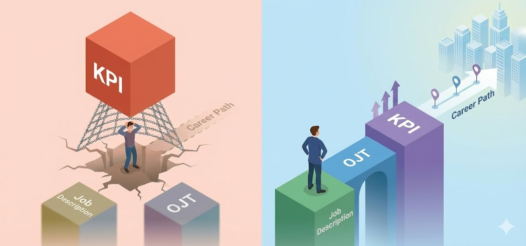 OJT là cầu nối giữa JD và KPI. Đây là quá trình biến mô tả và chỉ số thành năng lực thực tế thông qua kèm cặp, chuẩn hóa thao tác, và phản hồi liên tục trong công việc thật.