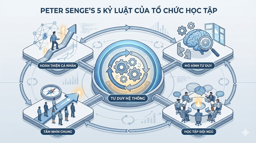 Cấu trúc 5 Kỷ luật của Peter Senge Peter Senge không xem Learning Organization là một chương trình đào tạo, mà là một năng lực quản trị mang tính hệ thống. Trong tác phẩm The Fifth Discipline, ông chỉ ra rằng một tổ chức chỉ thực sự "học" khi kết hợp nhuần nhuyễn 5 yếu tố: