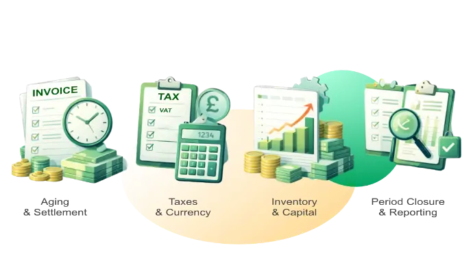 - Công nợ & thanh toán: aging, settlement, đối chiếu ngân hàng