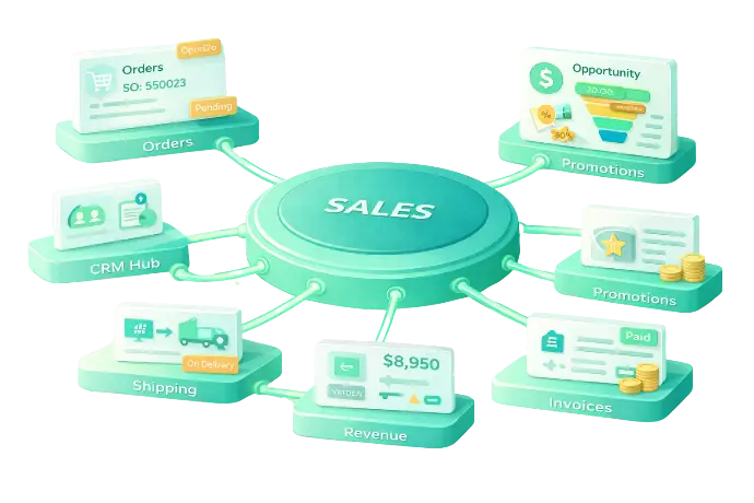 Sales không tách rời khỏi vận hành thực tế mà có thể đóng vai trò trung tâm cho dữ liệu đơn hàng từ TMĐT, POS và các hợp đồng điện tử trong cùng một bức tranh bán hàng.