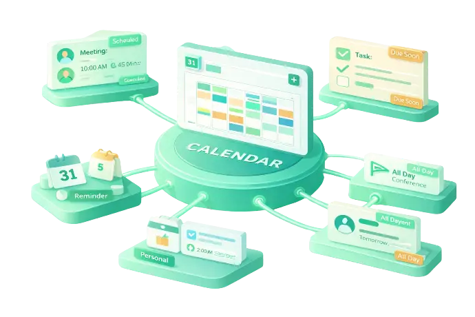 Hệ thống hỗ trợ nhắc lịch, theo dõi tham gia và điều phối tài nguyên như phòng họp, lịch nhân sự hoặc các hoạt động cần phối hợp.